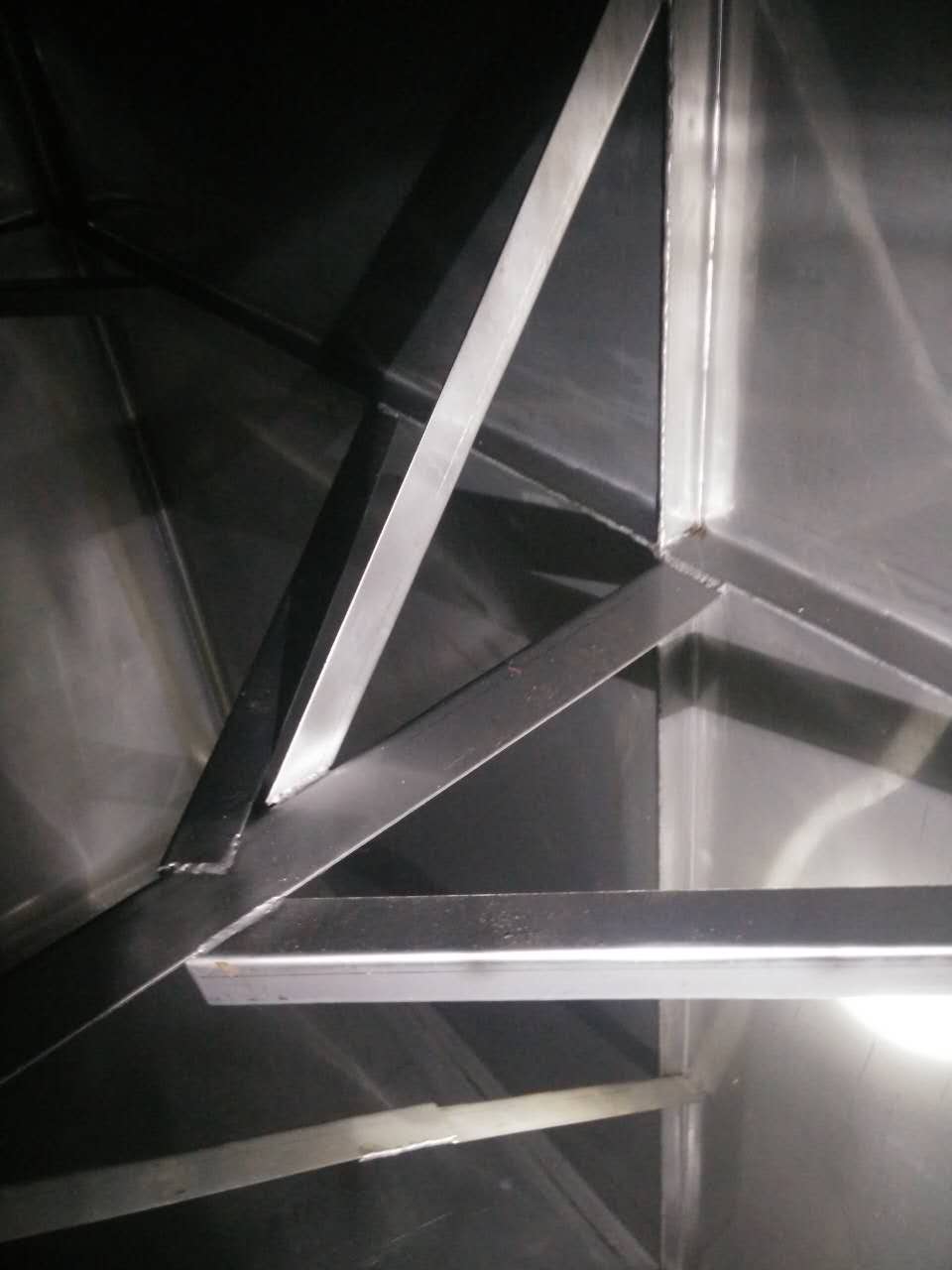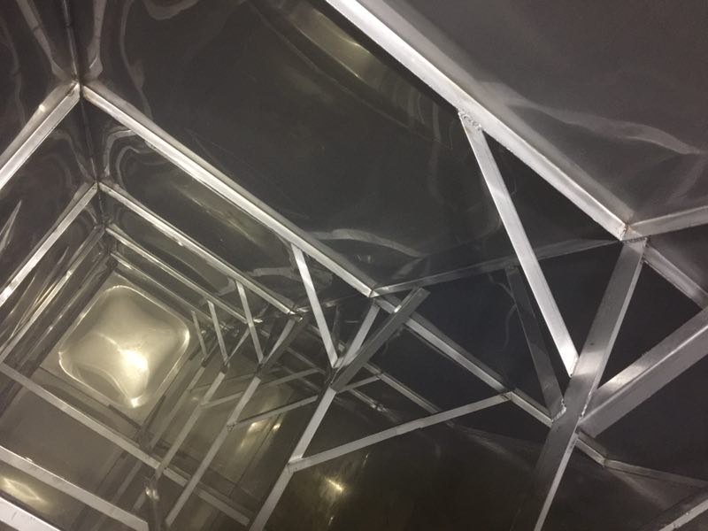 主拉主要作用是防止水箱變形,厚度一般采用靠近底板的側板厚度為基準,規(guī)格為4cm*4cm。其焊接間距一般為1000mm一條,大型水箱特別是高度超過3米以上的。其間距應該為500mm一條,連接處必須進行滿焊處理。