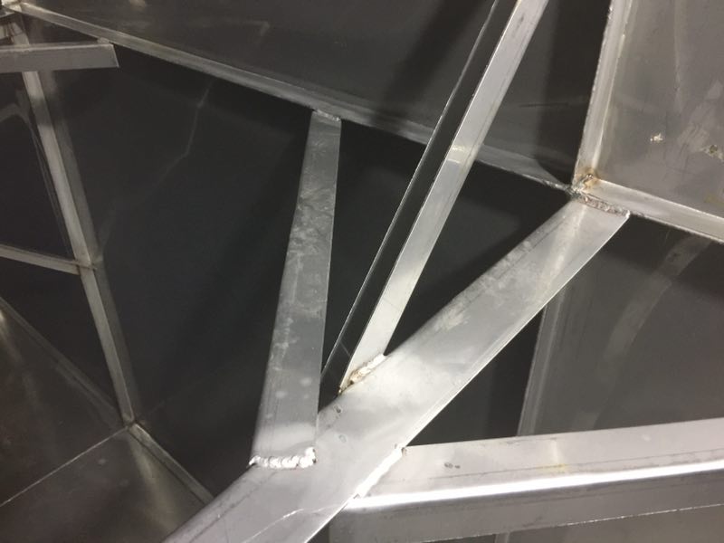 斜拉主要的作用在于分擔主拉筋的拉力,進一步對水箱板進行穩(wěn)固,切成500mm的長度,連接在水箱與主拉之間。形成龍爪式,常規(guī)尺寸為4cm*1cm厚度一般以靠近頂部的側板厚度為基準,連接處必須進行滿焊處理。